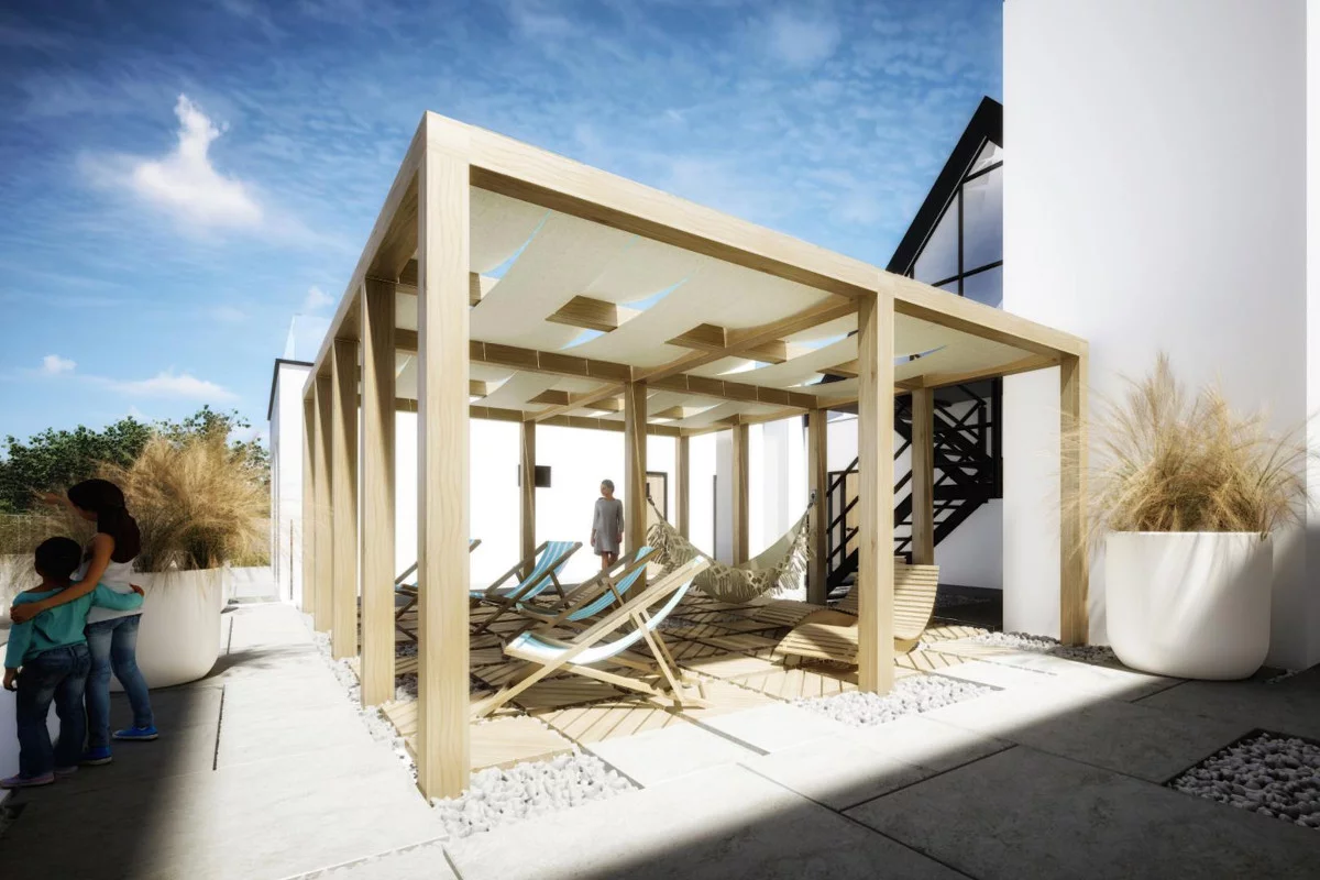 3. Pomieszczenia: salon, pokój, WC, kuchnia z jadalnią, przedsionek, ogródek. Dwupokojowe apartamenty – 39,40–48,00 m². Idealne dla par planujących dłuższe pobyty, rodzin 2+1 oraz inwestorów oczekujących wysokiej funkcjonalności. Oddzielny pokój sprawdzi się jako sypialnia lub gabinet, przedsionek ułatwia przechowywanie rzeczy plażowych, a ogródek poszerza przestrzeń dzienną o prywatną strefę wypoczynku. Zaletą jest osobna kuchnia: zapewnia komfort gotowania, możliwość domknięcia strefy kulinarnej podczas spotkań oraz swobodę korzystania z salonu bez kompromisów.