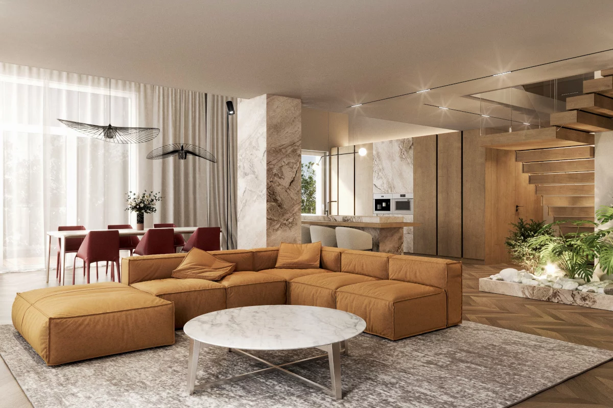 8. salon z aneksem kuchennym i jadalnią, sypialnia dla gości, sypialnia małżeńska, sypialnia dla dziecka, łazienka, łazienka, garderoba na odzież wierzchnią, przedsionek, ogródek, taras. Czteropokojowe — 82,19 m² idealne dla rodziny ceniącej kontakt z zielenią i wygodę przyjmowania gości. Zaletą jest ilość łazienek — komfort poranków oraz swoboda podczas rodzinnych wizyt. Osobna sypialnia dla gości daje prywatność i elastyczność funkcji, a garderoba na odzież wierzchnią utrzymuje ład w strefie wejścia. Ogródek z tarasem tworzy przyjemną strefę wypoczynku na świeżym powietrzu.