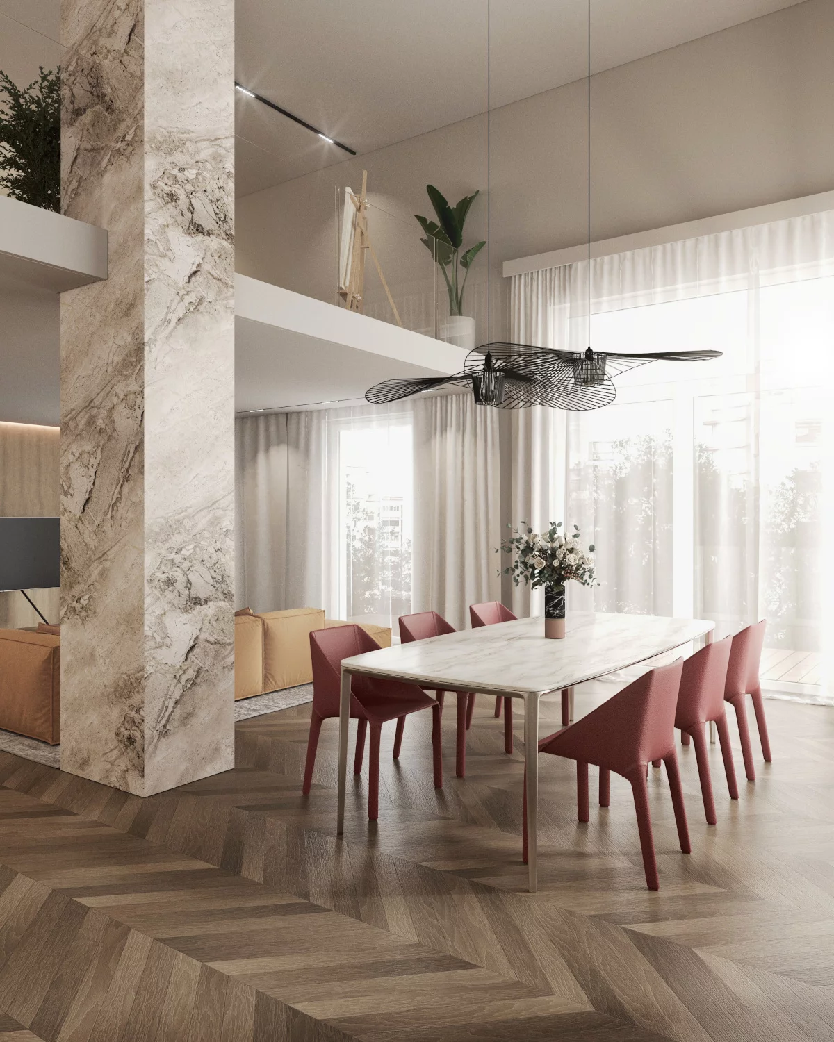 10. Strefa dzienna z dodatkowym pokojem: salon z aneksem kuchennym i jadalnią, łazienka, pokój, przedsionek, balkon. Strefa małżeńska na antresoli: sypialnia małżeńska na antresoli. Dwupoziomowe, trzypokojowe — 84,53 m² to świetny wybór dla pary lub rodziny 2+1. Zaletą jest sypialnia małżeńska na antresoli: zapewnia wyciszoną, kameralną przestrzeń, wyraźnie oddzielając nocny odpoczynek od życia dziennego. Dodatkowy pokój na poziomie dziennym elastycznie pełni rolę gabinetu, pokoju dziecka lub gościnnego.
