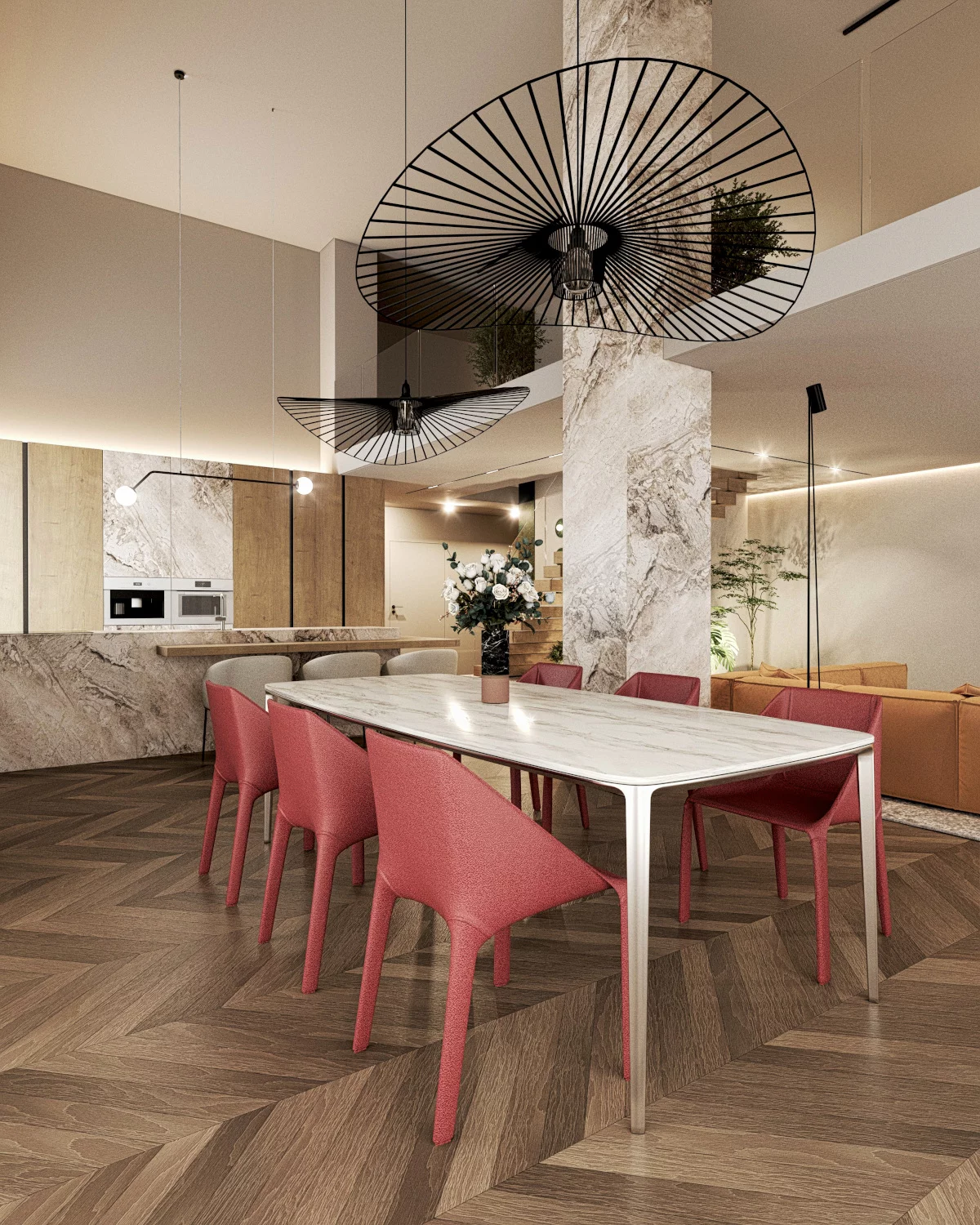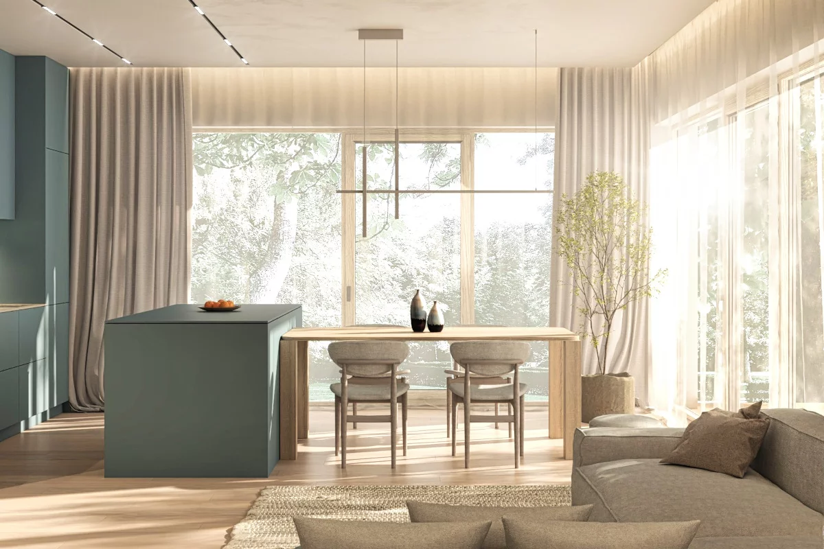 12. salon z aneksem kuchennym i jadalnią, sypialnia małżeńska, sypialnia dla gości, sypialnia dla dziecka, prywatna garderoba, łazienka, łazienka, przedsionek. Czteropokojowe — 102,97 m² będzie idealne dla wymagającej rodziny ceniącej porządek i prywatność. Zaletą jest ilość łazienek — wygoda na co dzień i podczas wizyt. Osobna sypialnia dla gości podnosi standard przyjmowania bliskich, a prywatna garderoba przy sypialni rodziców upraszcza organizację ubrań i utrzymanie strefy nocnej w ładzie.