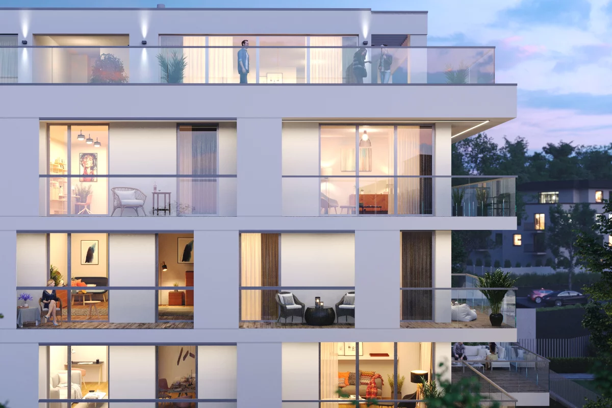3. salon z aneksem kuchennym i jadalnią, sypialnia małżeńska, sypialnia dla dziecka, łazienka, przedsionek, balkon. Trzypokojowe — 55,56 m² to funkcjonalny układ dla rodziny lub pary z planami powiększenia rodziny; drugi pokój może pełnić rolę gabinetu. Atutem jest balans między metrażem a liczbą pomieszczeń oraz wygodny balkon na chwilę oddechu.