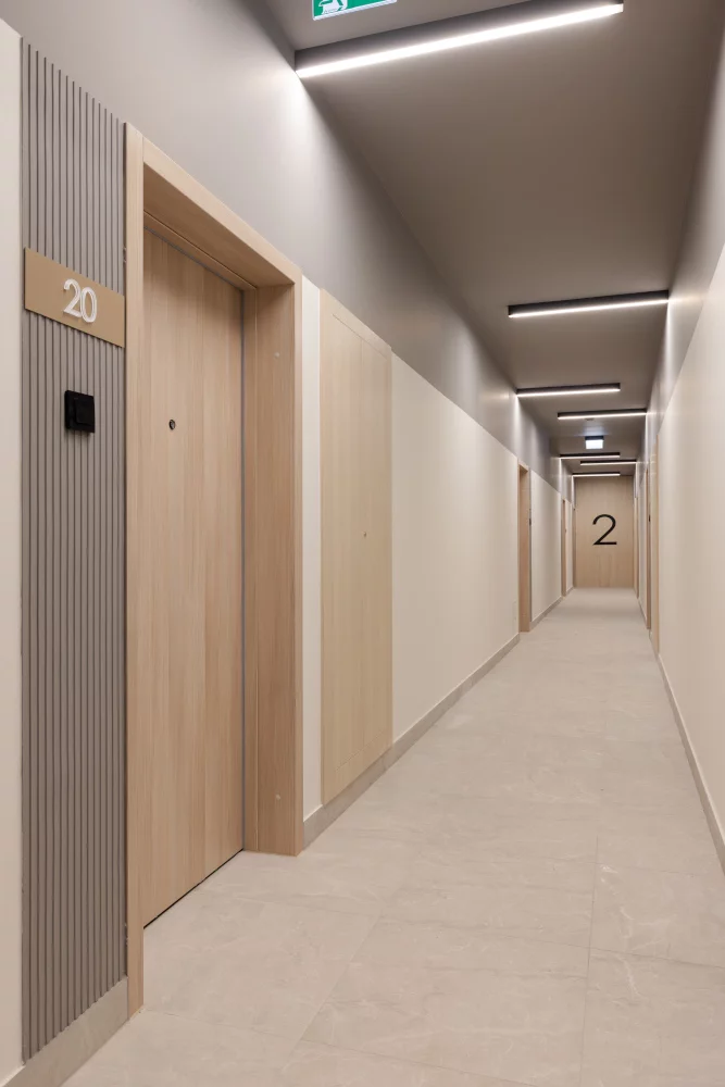 16. salon z jadalnią, sypialnia małżeńska, sypialnia dla dziecka, łazienka, WC, przedsionek, loggia. Trzypokojowe mieszkania 65,60–77,30 m² – dla rodzin, którym zależy na wygodnej logistyce dnia. Zaletą jest osobne WC: skraca poranne kolejki, zwiększa komfort przy odwiedzinach i ułatwia utrzymanie higieny w łazience.