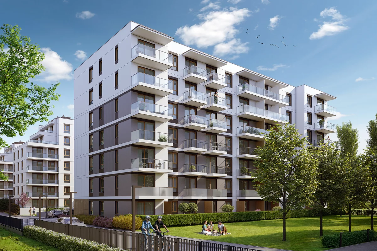 6) Salon z aneksem kuchennym i jadalnią, sypialnia małżeńska, łazienka, przedsionek, balkon. Dwupokojowe mieszkania 38,99–47,97 m². Świetne dla młodej pary; klarowny podział na strefę dzienną i nocną ułatwia codzienność, a balkon poszerza przestrzeń użytkową.