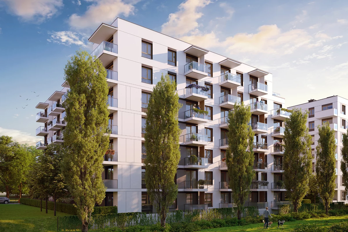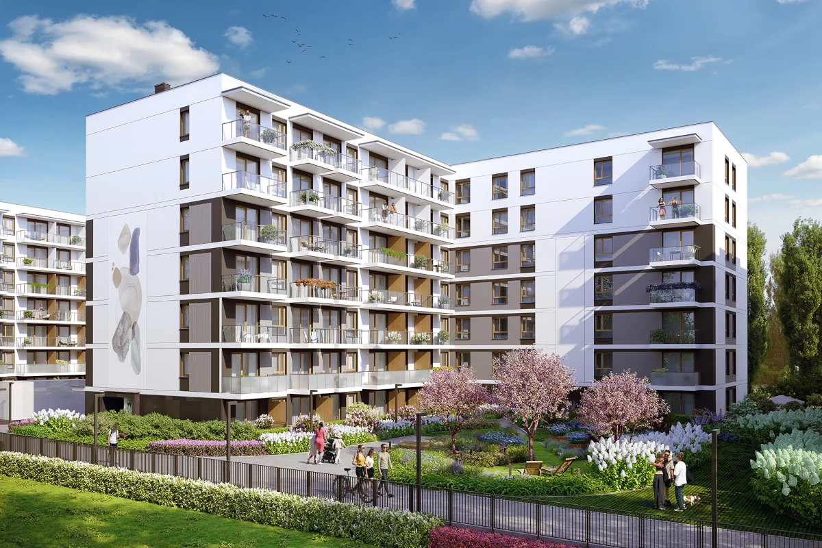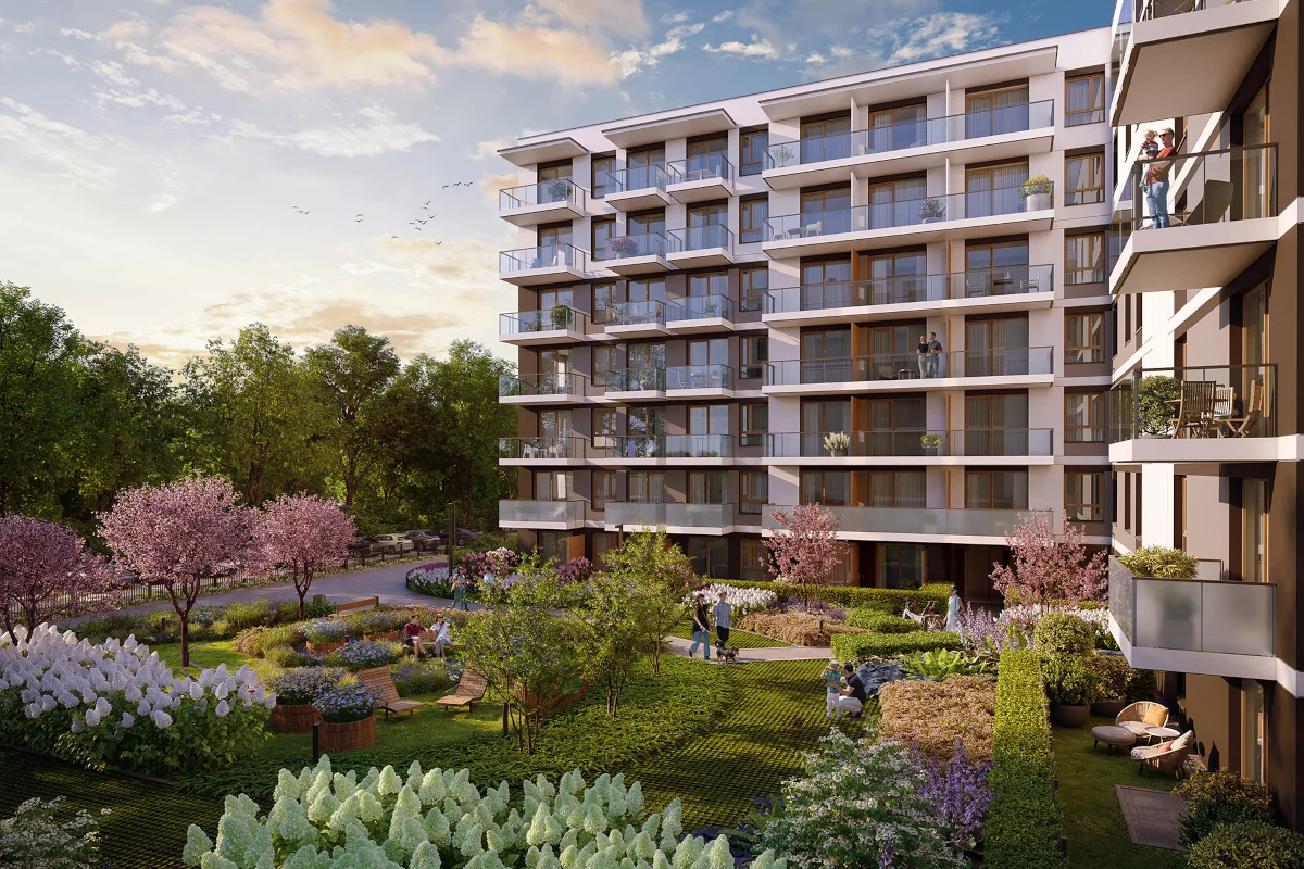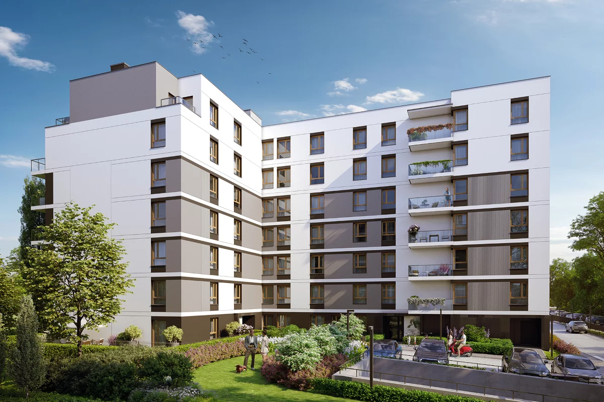 7) Salon z aneksem kuchennym i jadalnią, sypialnia małżeńska, łazienka, przedsionek, ogródek. Dwupokojowe mieszkania 42,48–47,97 m² z ogródkiem. Dla par i właścicieli czworonogów; własny skrawek zieleni to komfort poranków na zewnątrz i większa swoboda aranżacji.