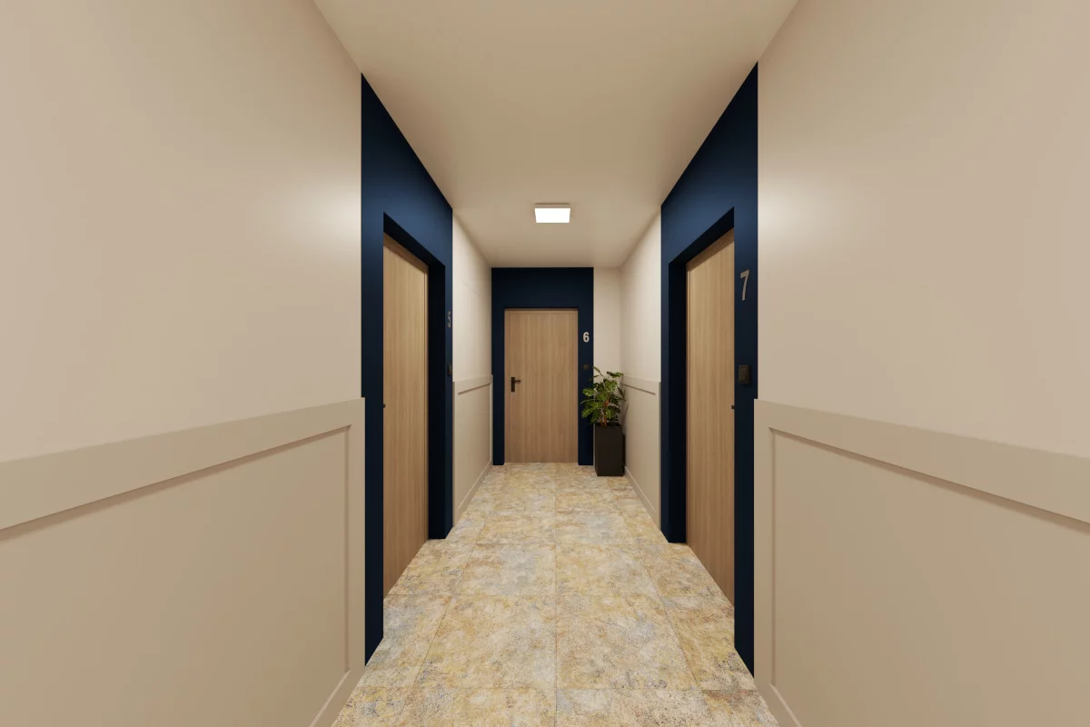 Pomieszczenia: salon z aneksem kuchennym i jadalnią, sypialnia małżeńska, dwie sypialnie dla dzieci, łazienka, spiżarnia, WC, korytarz wewnętrzny, balkon. Dla rodzin potrzebujących czytelnego podziału stref. Dwie sypialnie dla dzieci dają niezależność, osobne WC zwiększa wygodę, a spiżarnia pomaga w sprytnej organizacji zakupów i akcesoriów kuchennych.