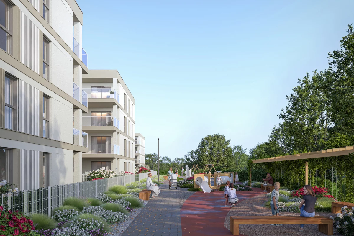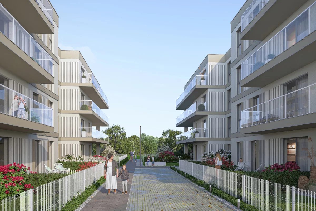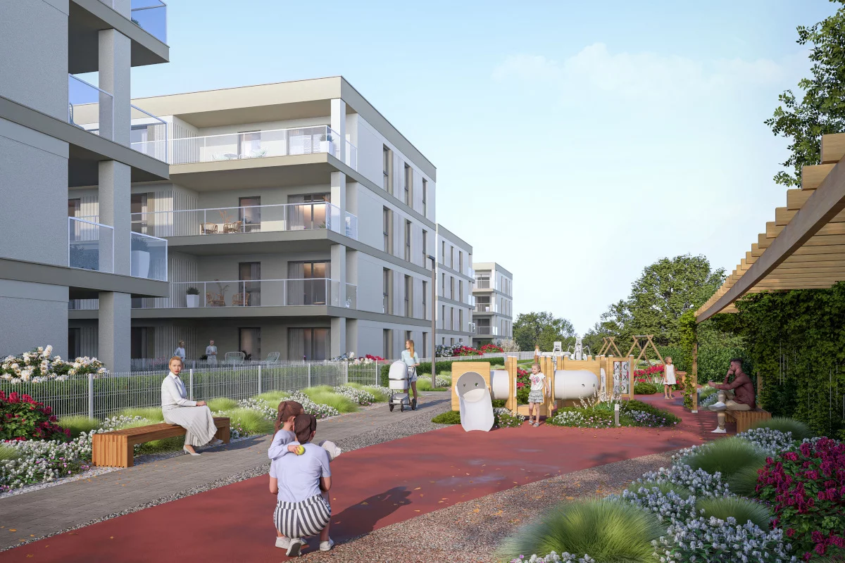 Pomieszczenia: salon z aneksem kuchennym i jadalnią, sypialnia małżeńska, sypialnia dla dziecka, łazienka, przedsionek, ogródek, taras. Dla rodzin, które chcą mieć kontakt z zielenią bez rezygnacji z wygody mieszkania. Ogródek i taras tworzą prywatną strefę relaksu, zabawy dla dzieci lub miejsce na małe przyjęcia.