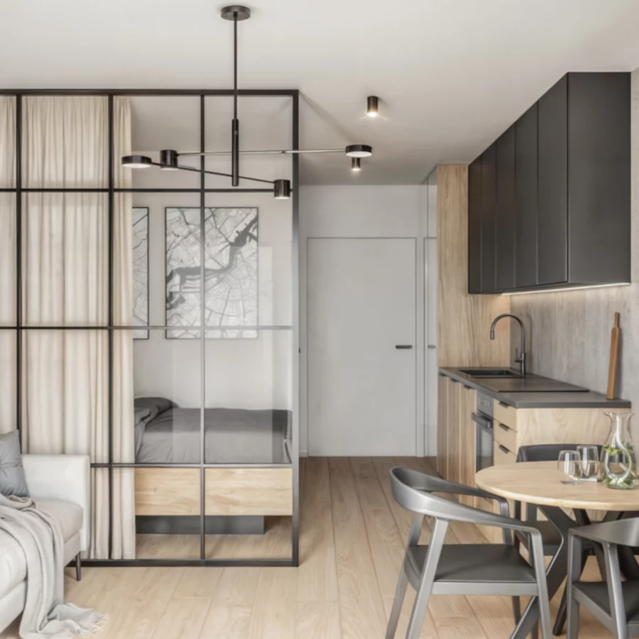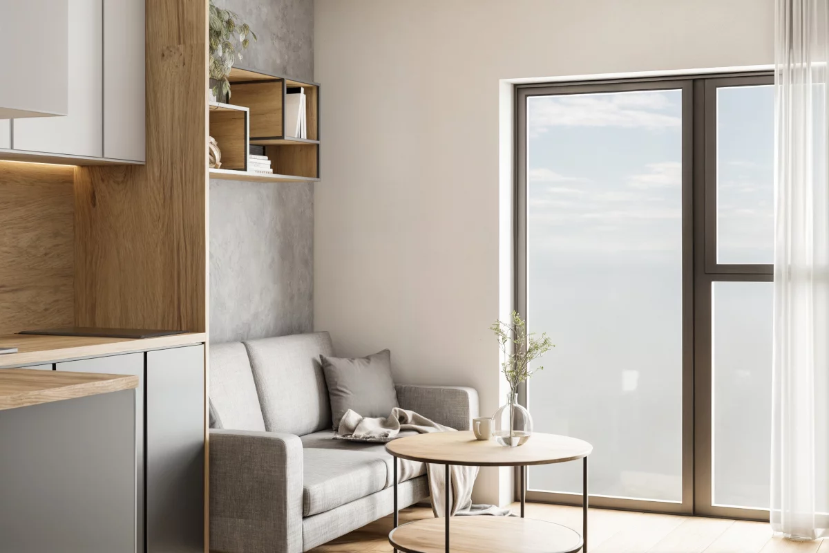 2. Dwupokojowe mieszkania o powierzchni od 19,50 m² do 32,60 m² zawierające salon z aneksem kuchennym i jadalnią oraz łazienkę. Te nieco większe przestrzenie są stworzone z myślą o dłuższym pobycie. Dedykowane są głównie parom lub młodym profesjonalistom, którzy potrzebują dodatkowej przestrzeni na domowe biuro lub dodatkowy pokój relaksu. Zapewniają większą elastyczność w aranżacji, co pozwala na lepsze dostosowanie wnętrza do indywidualnych potrzeb mieszkańców.