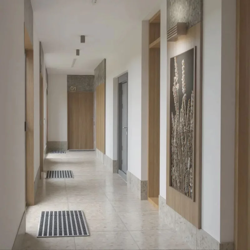 22. salon z aneksem kuchennym i jadalnią, sypialnia małżeńska, sypialnia dla dziecka, łazienka, łazienka, przedsionek, balkon. trzypokojowe mieszkanie o powierzchni 68,21 m² — Dla rodzin i par pracujących z domu. Ilość łazienek to wyraźna przewaga — można rozdzielić funkcję dzienną i nocną lub stworzyć łazienkę rodziców i dzieci, co przekłada się na wygodę. Balkon uzupełnia strefę wypoczynku.