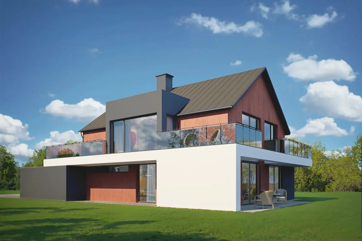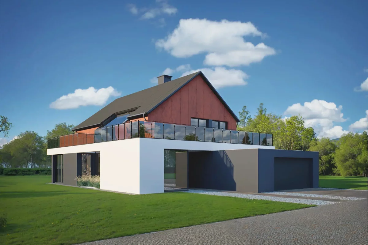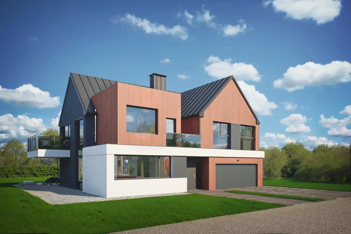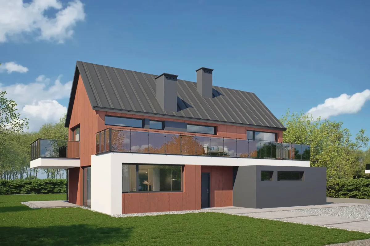 Strefa dzienna: salon z aneksem kuchennym i jadalnią, garaż, sypialnia dla dziecka, garderoba na odzież codzienną, oranżeria, łazienka, korytarz wewnętrzny, wiatrołap, taras. Strefa prywatna: sypialnia małżeńska, sypialnia dla dziecka, sypialnia dla dziecka, łazienka, łazienka, pralnia, prywatna garderoba, korytarz wewnętrzny, taras, taras. Idealny dla rodziny 2+3 lub 2+2 z potrzebą dodatkowego pokoju na parterze. Trzy sypialnie dla dzieci ułatwiają zaaranżowanie oddzielnych pokoi lub strefy rodzeństwa. Trzy łazienki (jedna na dole i dwie na górze) zapewniają wysoki komfort użytkowania. Dwie garderoby, w tym osobna garderoba na odzież codzienną i prywatna garderoba przy sypialni rodziców, porządkują przechowywanie. Trzy tarasy zwiększają możliwości wypoczynku. Oranżeria wspiera domowe pasje, a osobna pralnia porządkuje prace domowe i utrzymuje ład.