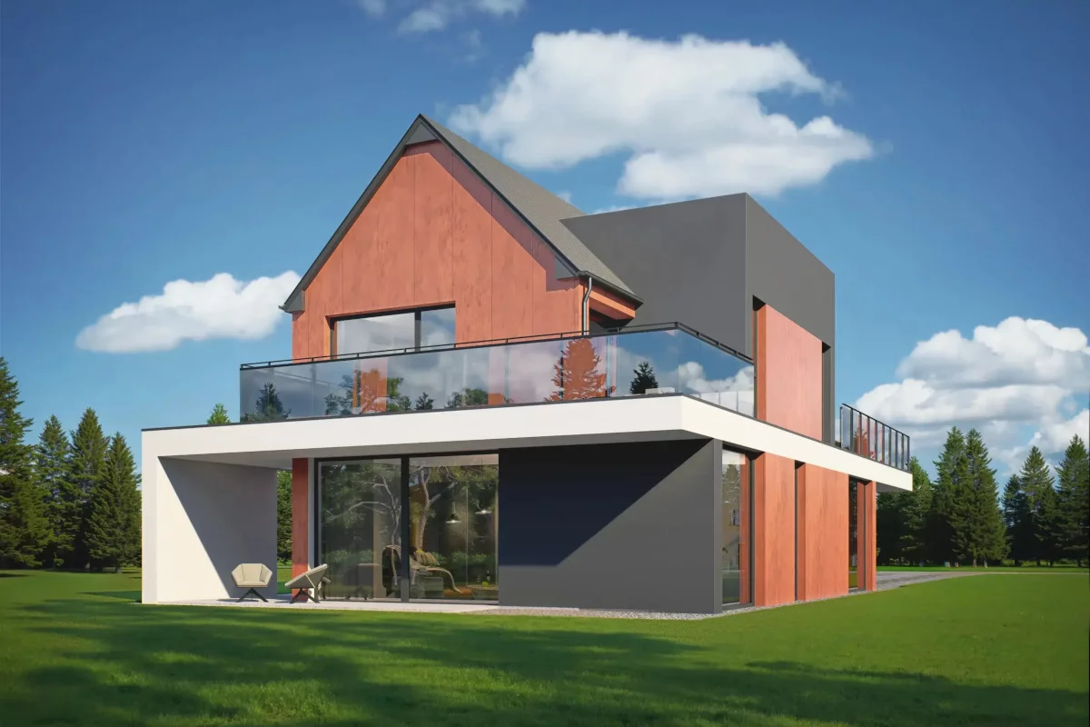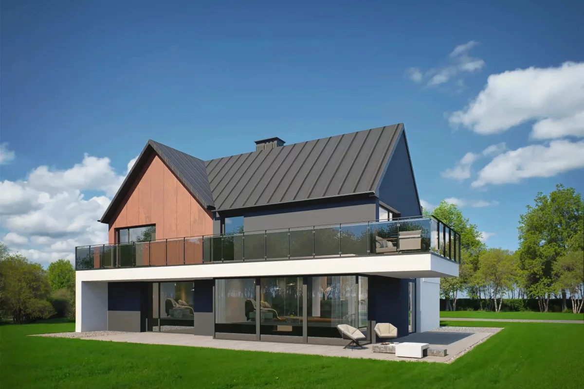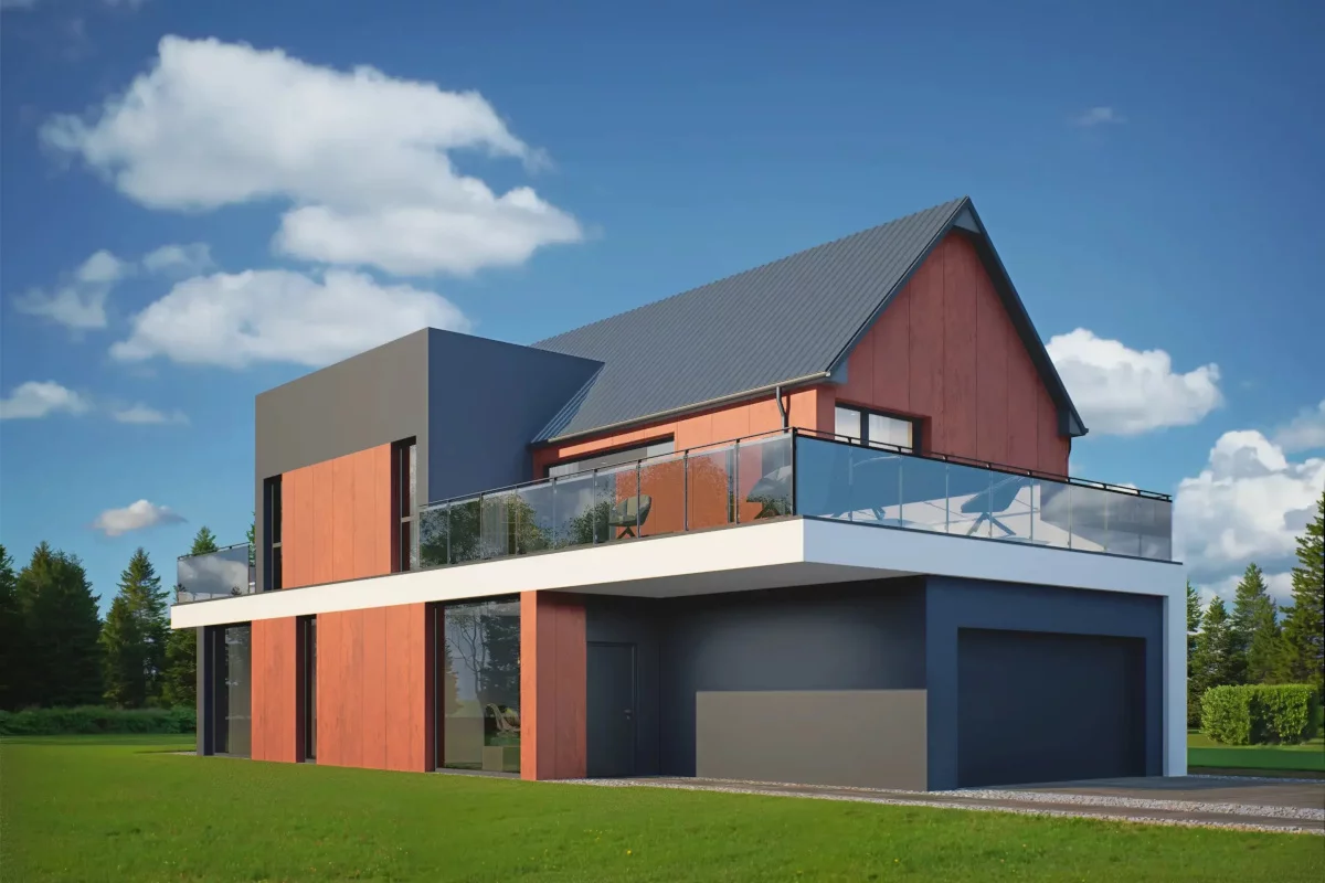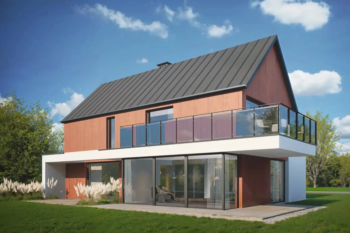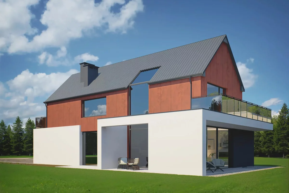 Strefa dzienna: salon z aneksem kuchennym i jadalnią, garaż, sypialnia dla dziecka, garderoba na odzież codzienną, oranżeria, łazienka, korytarz wewnętrzny, wiatrołap, taras. Strefa prywatna: sypialnia małżeńska, sypialnia dla dziecka, sypialnia dla dziecka, łazienka, łazienka, pralnia, prywatna garderoba, korytarz wewnętrzny, taras, taras. Idealny dla rodziny 2+3 lub 2+2 z potrzebą dodatkowego pokoju na parterze. Trzy sypialnie dla dzieci ułatwiają zaaranżowanie oddzielnych pokoi lub strefy rodzeństwa. Trzy łazienki (jedna na dole i dwie na górze) zapewniają wysoki komfort użytkowania. Dwie garderoby, w tym osobna garderoba na odzież codzienną i prywatna garderoba przy sypialni rodziców, porządkują przechowywanie. Trzy tarasy zwiększają możliwości wypoczynku. Oranżeria wspiera domowe pasje, a osobna pralnia porządkuje prace domowe i utrzymuje ład.