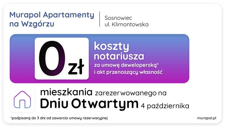 Deweloper oferuje pokrycie kosztów notarialnych zawarcia umowy deweloperskiej, pod warunkiem jej podpisania w ciągu 3 dni od zawarcia umowy rezerwacyjnej.