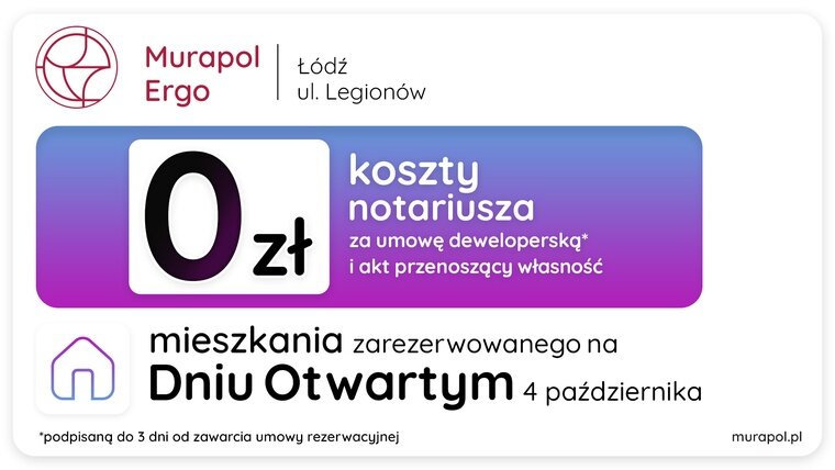 Podpisz umowę rezerwacyjną na wybrane mieszkanie oferty Murapol w Łodzi na Dniu Otwartym 4 października, a w ciągu kolejnych 3 dni umowę deweloperską/przedwstępną, to pokryjemy koszty notariusza UD/UP oraz aktu przenoszącego własność!