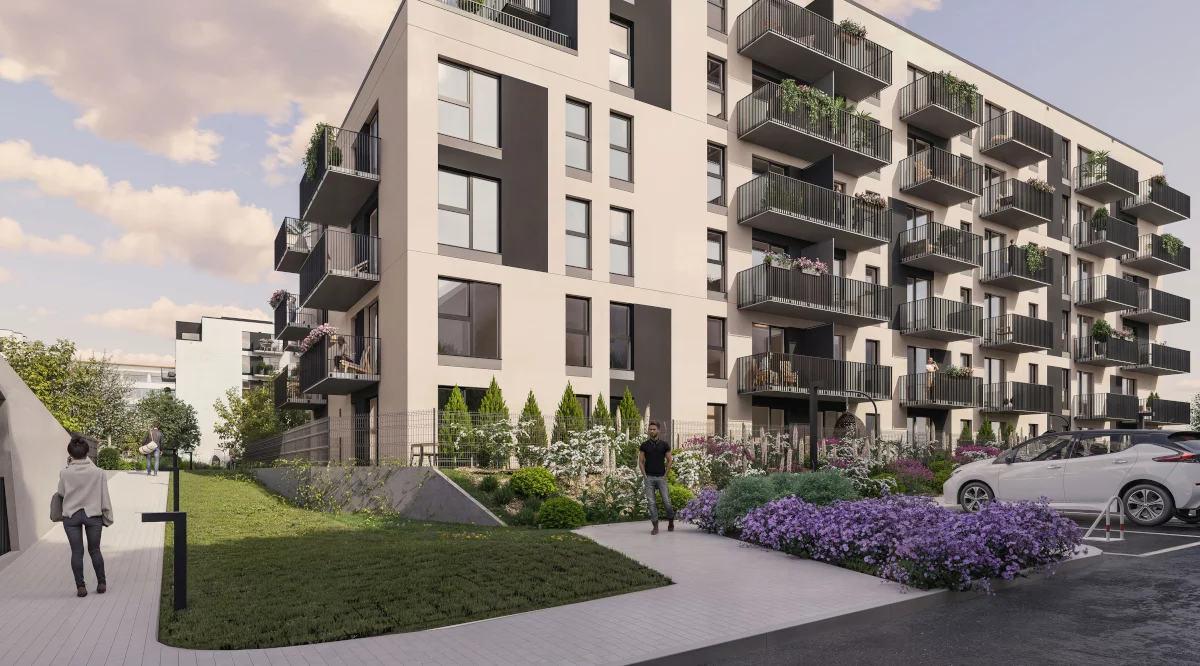 7. salon z aneksem kuchennym i jadalnią, sypialnia małżeńska, łazienka, przedsionek, ogródek. — Dwupokojowe, 33,74–46,86 m². Dla pary lub rodziny z małym dzieckiem oraz dla miłośników zieleni. Ogródek sprzyja weekendowym śniadaniom na świeżym powietrzu i zabawie z dziećmi.