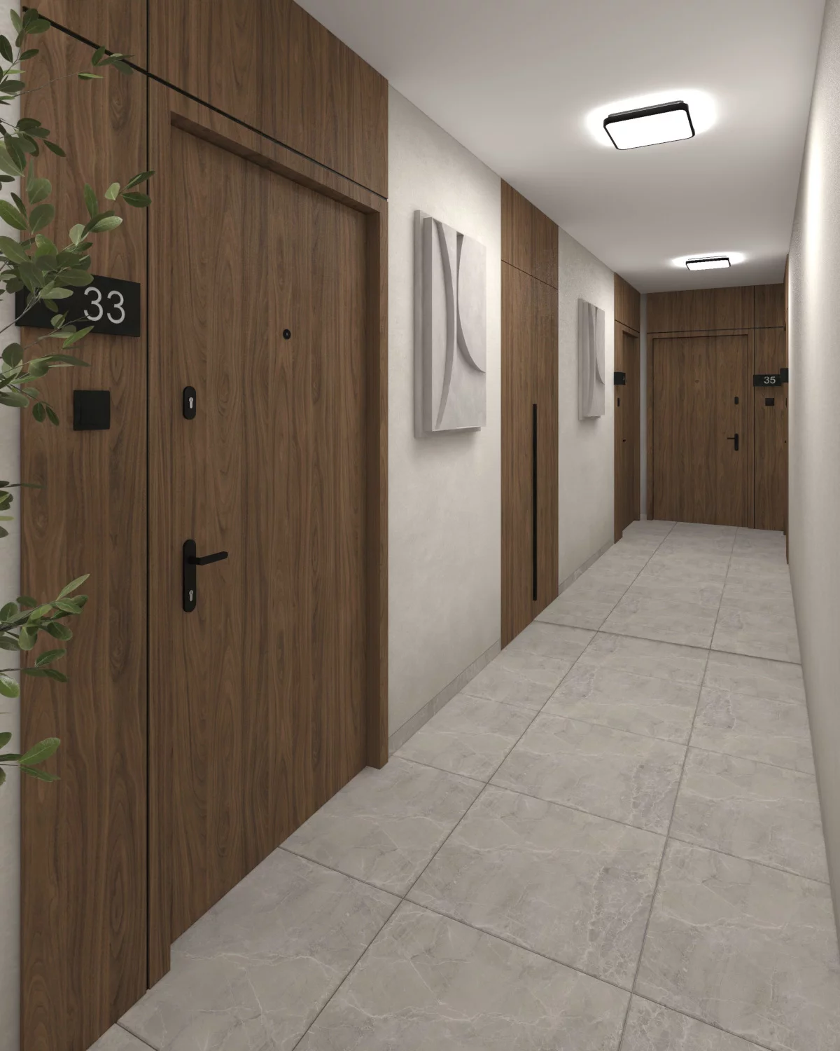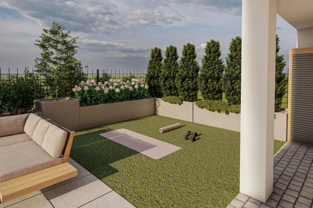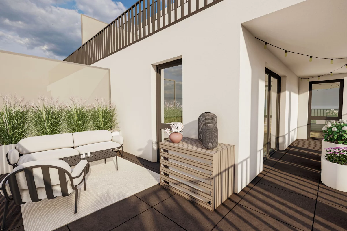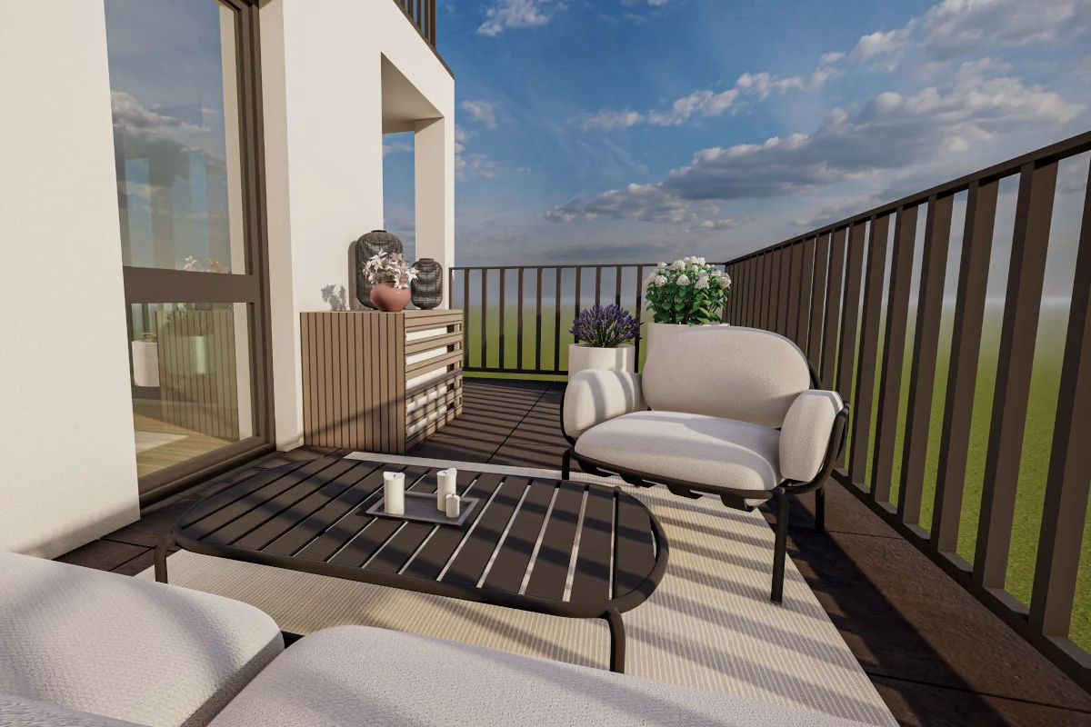 10. Aneks sypialny, sypialnia dla dziecka, sypialnia małżeńska, łazienka, WC, garderoba, korytarz wejściowy. (Dla rodziny 2+1 lub 2+2, która chce uniknąć porannych kolejek i mieć ład w domu.) Trzypokojowe mieszkania o powierzchni od 63,58 m² do 67,45 m² zapewniają wygodę dzięki osobnemu aneksowi sypialnemu, osobnej garderobie oraz osobnemu WC. Dodatkowa toaleta ułatwia funkcjonowanie o różnych porach dnia, a garderoba uwalnia pokoje od dużych szaf.