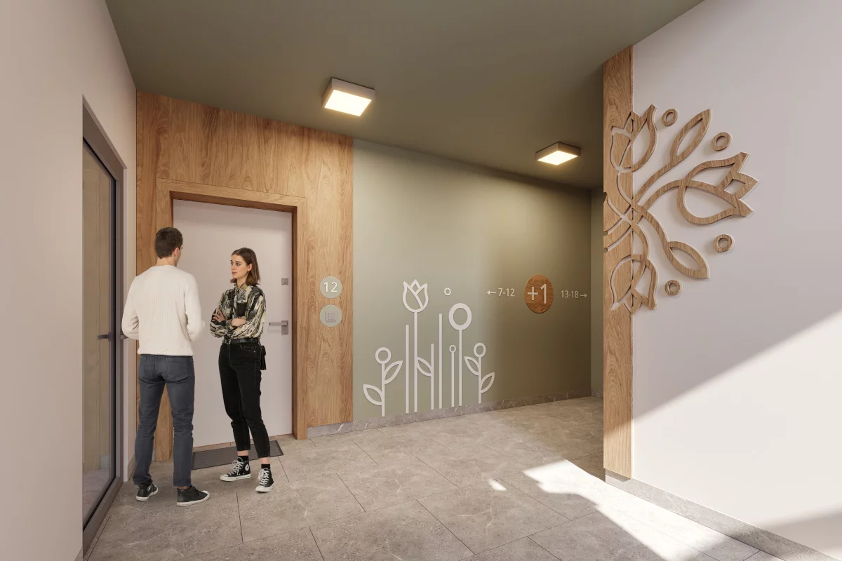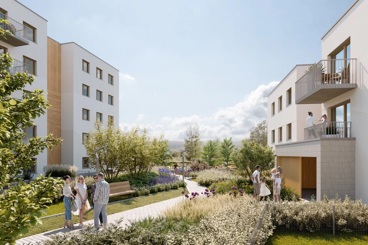 5. Salon z aneksem kuchennym i jadalnią, sypialnia małżeńska, łazienka, przedsionek, ogródek. Dwupokojowe mieszkania 34,35–38,26 m² to świetny kompromis dla pary lub młodej rodziny – ogródek daje przestrzeń dla dziecka lub pupila, a jadalnia z aneksem sprzyja wspólnemu gotowaniu i spotkaniom z przyjaciółmi.