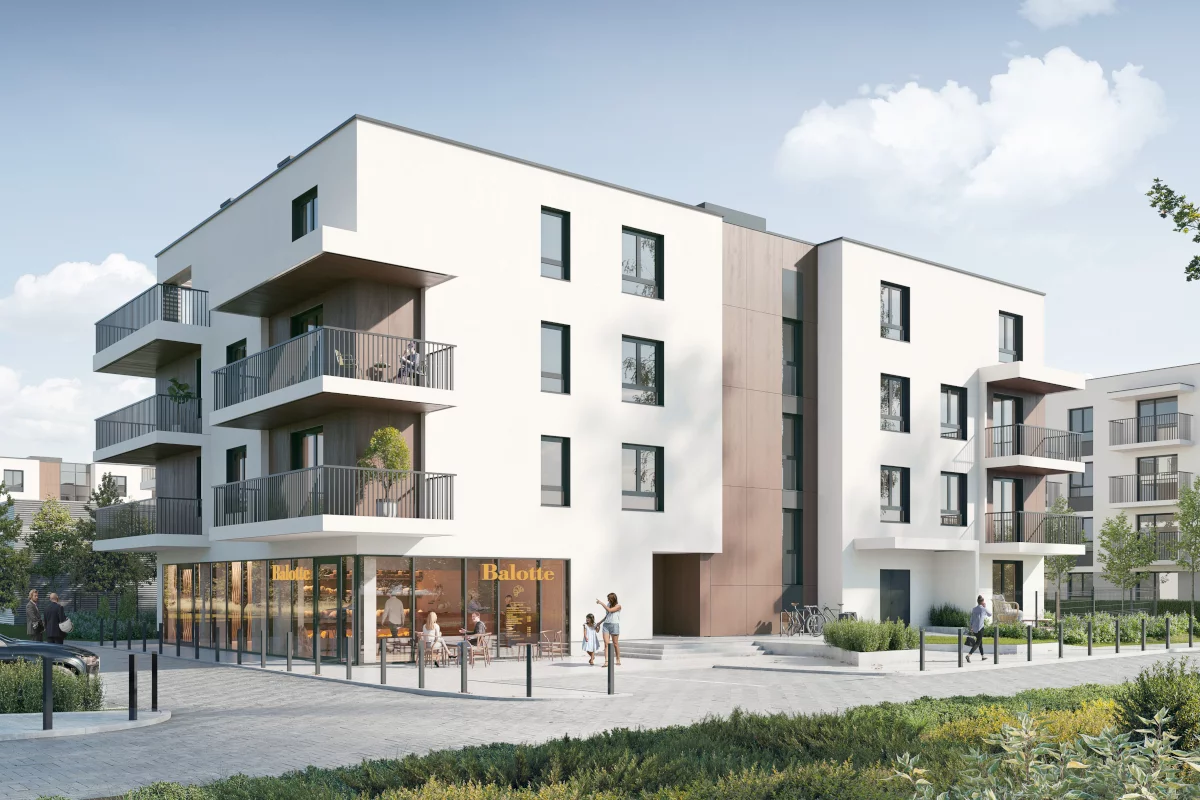 2. salon z aneksem kuchennym i jadalnią, sypialnia małżeńska, łazienka, przedsionek, ogródek. Dwupokojowe mieszkania – od 35,71 m² do 41,48 m². Idealne dla par i młodych rodzin, łączą komfort oddzielnej sypialni z przyjemnością prywatnej zieleni. Ogródek to naturalne przedłużenie strefy dziennej, a przedsionek ułatwia przechowywanie wierzchniej garderoby.