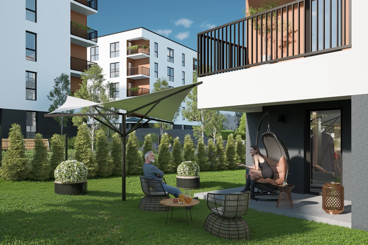 7) Dwupokojowe mieszkania – 40,17 m². Pomieszczenia: salon z aneksem kuchennym i jadalnią, sypialnia małżeńska, łazienka, prywatna garderoba, ogródek, taras. Świetne dla pary ceniącej praktyczność i kontakt z zielenią; prywatna garderoba to realna oszczędność miejsca w sypialni i salonie oraz łatwy sposób na utrzymanie ładu w rzeczach.