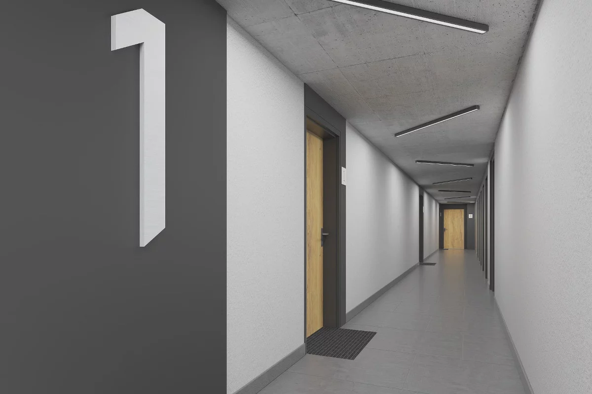 2. Salon z aneksem kuchennym i jadalnią, pokój, łazienka, przedsionek, balkon. Mieszkanie dwupokojowe 42,34–45,98 m². Dla pary lub wymagającego singla; dodatkowy pokój sprawdzi się jako sypialnia lub gabinet, balkon zapewnia przyjemną strefę relaksu, a układ pozwala wygodnie strefować życie codzienne.