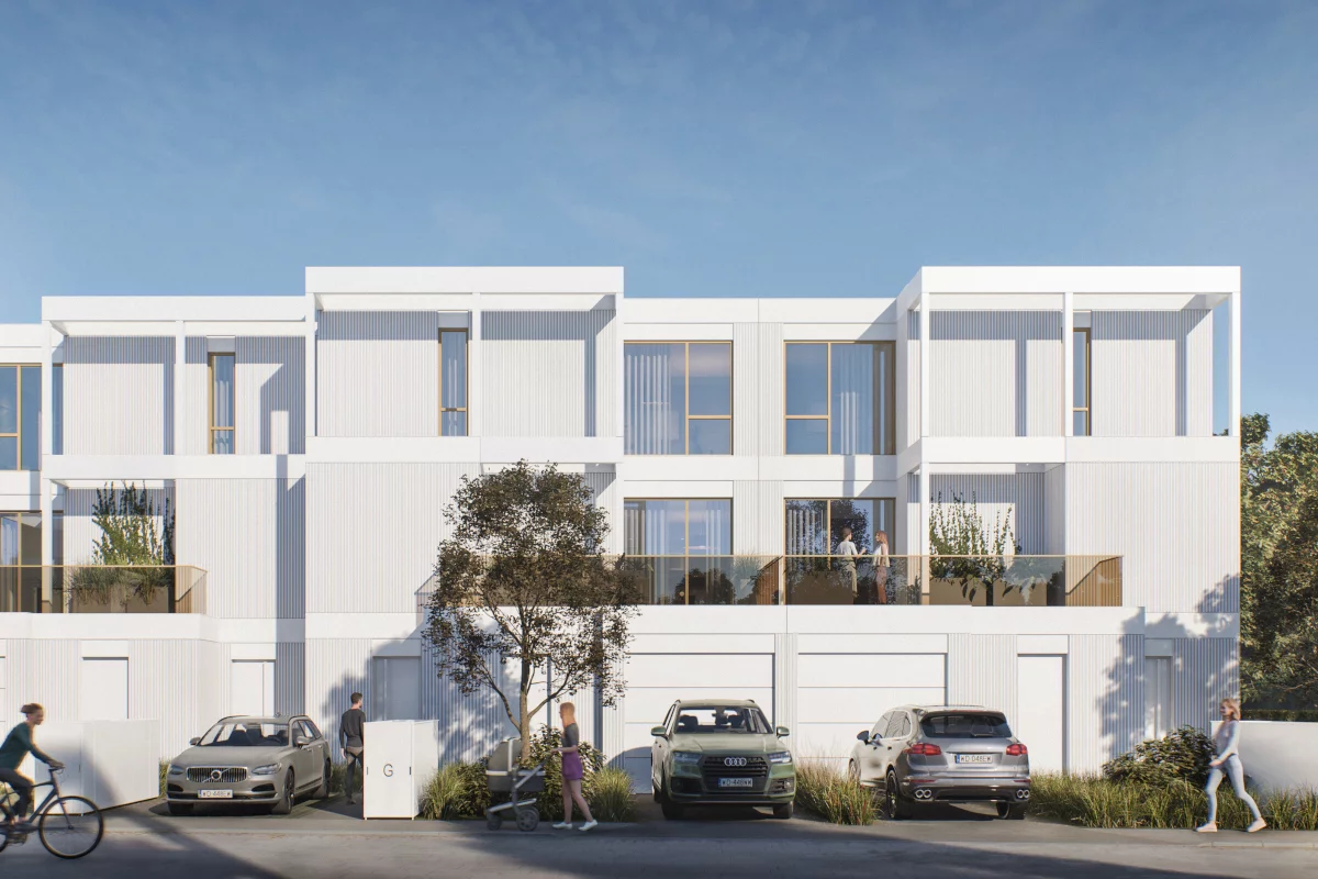 3. domy w zabudowie bliźniaczej — 170,50–176,86 m². Strefa dzienna: salon z jadalnią, garaż, kuchnia z jadalnią, WC, korytarz wewnętrzny, wiatrołap, ogródek. Strefa nocna: sypialnia małżeńska, pokój, sypialnia dla dziecka, łazienka, garderoba na odzież codzienną, korytarz wewnętrzny. Strefa prywatna: pokój, prywatna łazienka, pralnia. Świetny wybór dla rodziny 2+1 lub pary z potrzebą dwóch niezależnych gabinetów. Osobne WC na parterze porządkuje ruch domowników i gości. Dwie pełne łazienki, w tym prywatna, dają komfort niezależnych planów dnia. Wydzielona kuchnia pozwala gotować bez „przenoszenia” kuchennych spraw do salonu. Garderoba codzienna porządkuje przechowywanie, a osobna pralnia integruje pranie, suszenie i przechowywanie chemii.