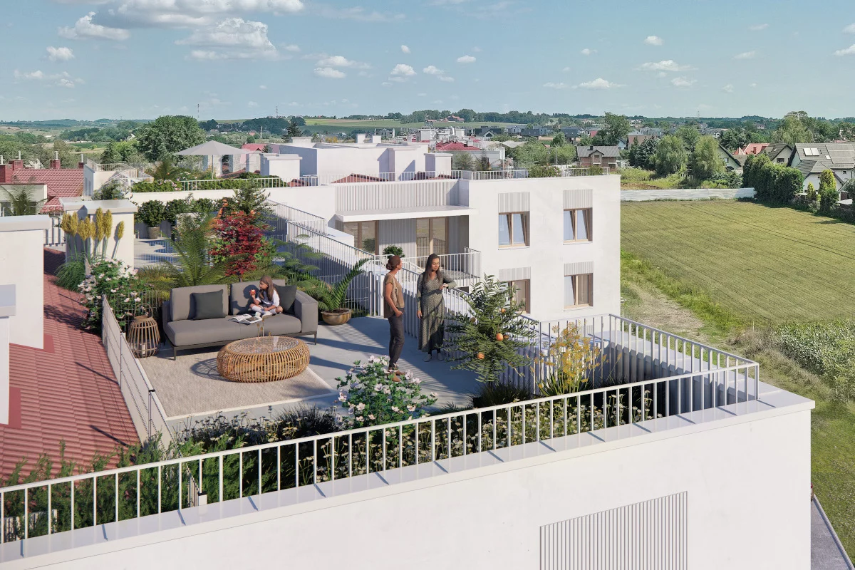 16) Salon z aneksem kuchennym i jadalnią, sypialnia małżeńska, sypialnia dla dziecka, pokój, łazienka, WC, przedsionek, korytarz prywatny, ogródek. Czteropokojowe | 65,09–65,10 m² – dla rodzin z potrzebą dodatkowego gabinetu lub pokoju zabaw; zaletą jest osobne WC, które porządkuje codzienną logistykę, a korytarz prywatny wycisza strefy nocne.