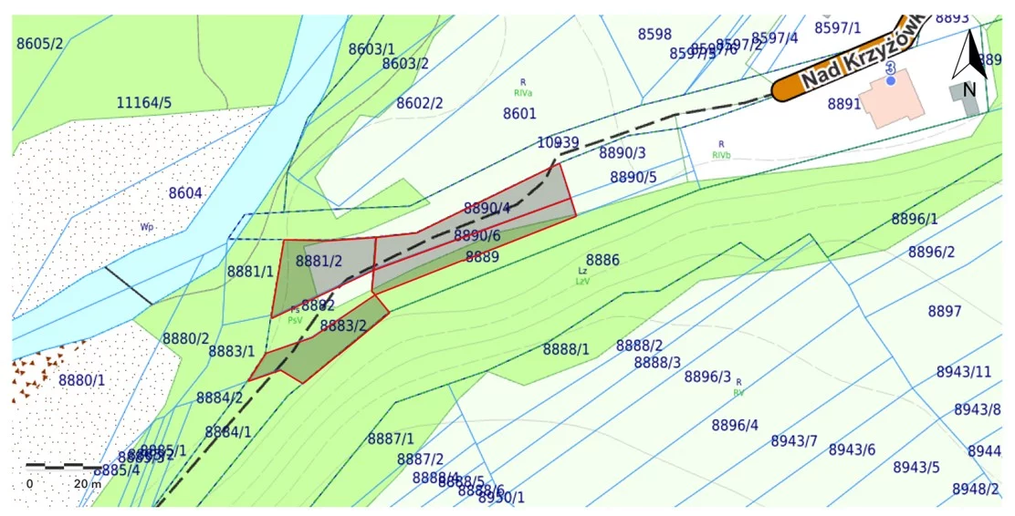 w rejonie ul. Nad Krzyżówką zapisanych w księdze wieczystej nr BB1Z/00111400/3 prowadzonej przez Sąd Rejonowy w Żywcu oraz jednostce rejestrowej G2308,