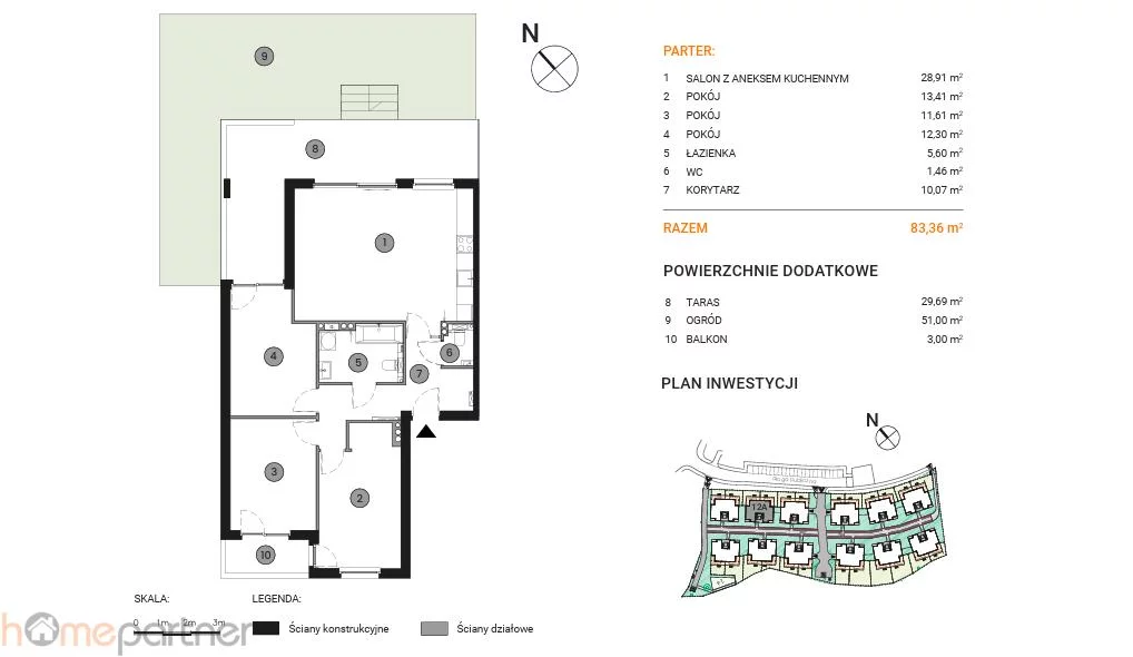 Do mieszkania przynależy ogródek (51m2) z tarasem (29,69m2) oraz balkon (3m2).
