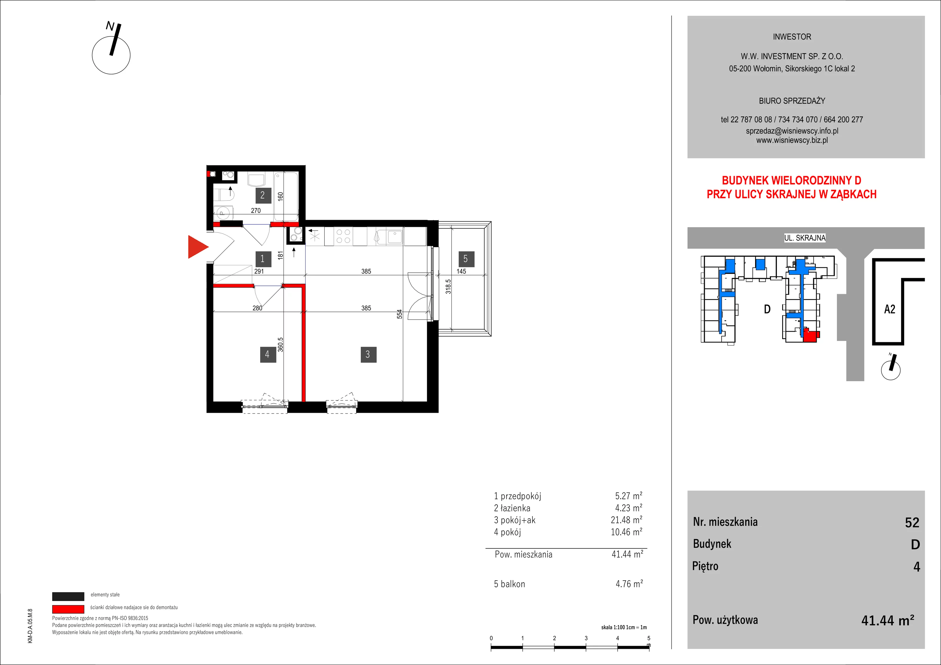 Mieszkanie 2 pokojowe o powierzchni 41,44 m² zlokalizowane na 4 piętrze w budynku czteropiętrowym.